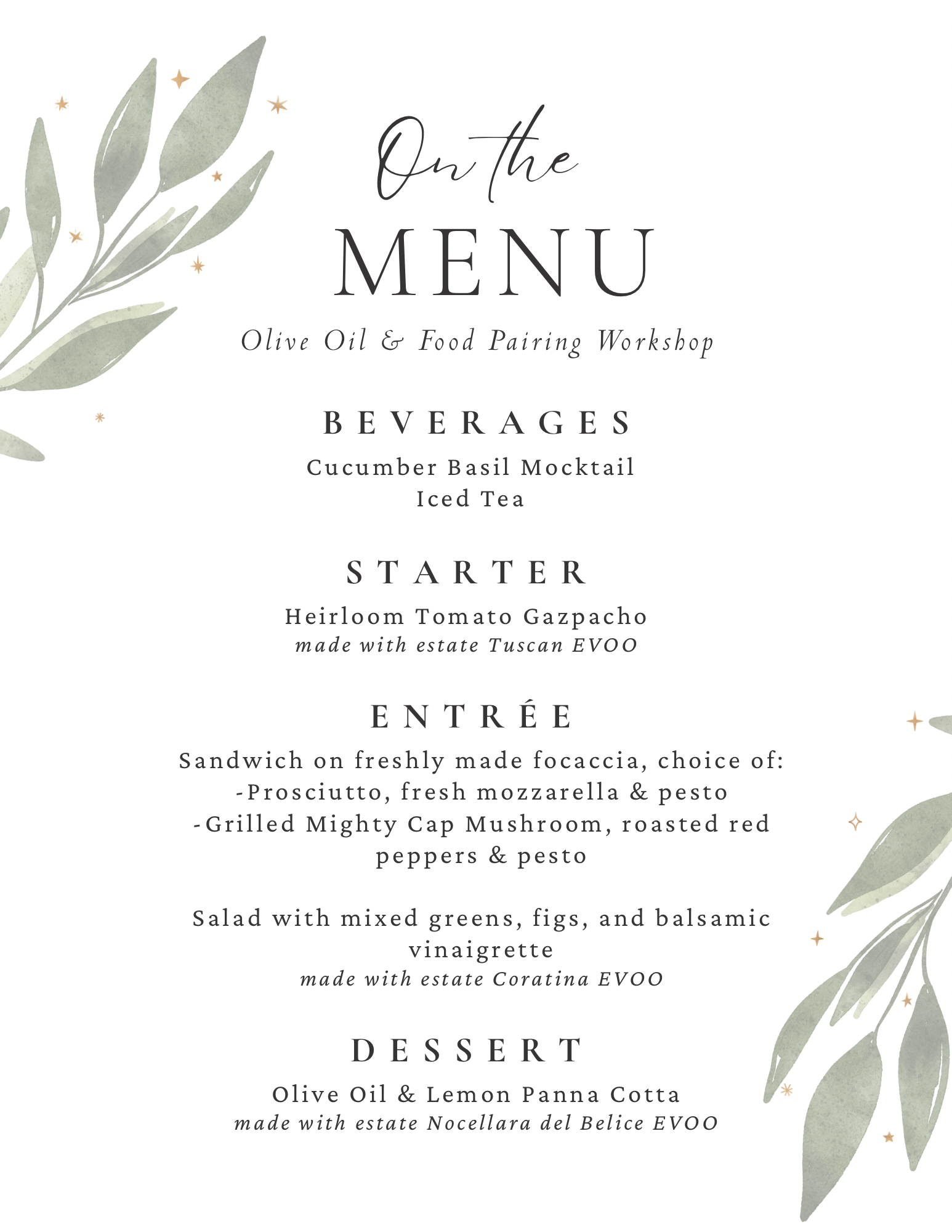 Once your palate has been inspired, sit back and savor a seasonal, farm-fresh lunch highlighting the unique flavor of each olive oil variety. We'll feature local, fall-inspired ingredients that beautifully complement and elevate the oils you've just explored.